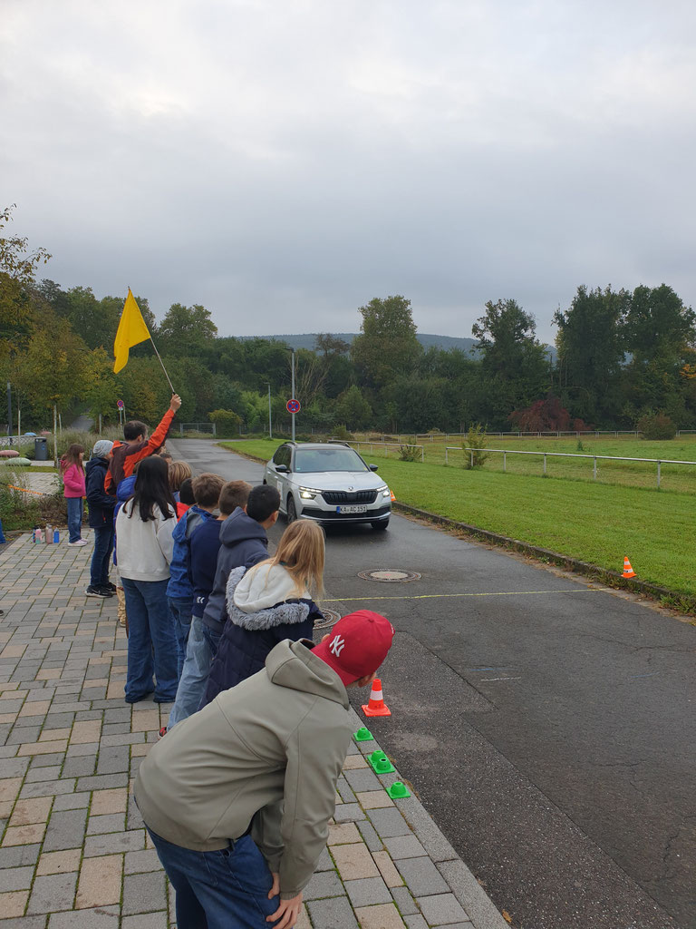 Drei Tage lang lernten die Schülerinnen und Schüler der fünften und sechsten Klasse den Unterschied des Reaktonswegs, Bremswegs und Anhaltewegs eines Autos. Sie durften dies bei einem 30km/h und 50km/h schnellen Autos schätzen und später auch noch einmal im Auto mitbekommen, wie sich so eine Vollbremsung anfühlt. Weitere Themen waren , Fahrradhelme und Ablenkung im Straßenverkehr durch Smartphones oder Kopfhörer. Wir danken Frau Schmitt, die alle 8 Klassen durch das Programm geführt hat!