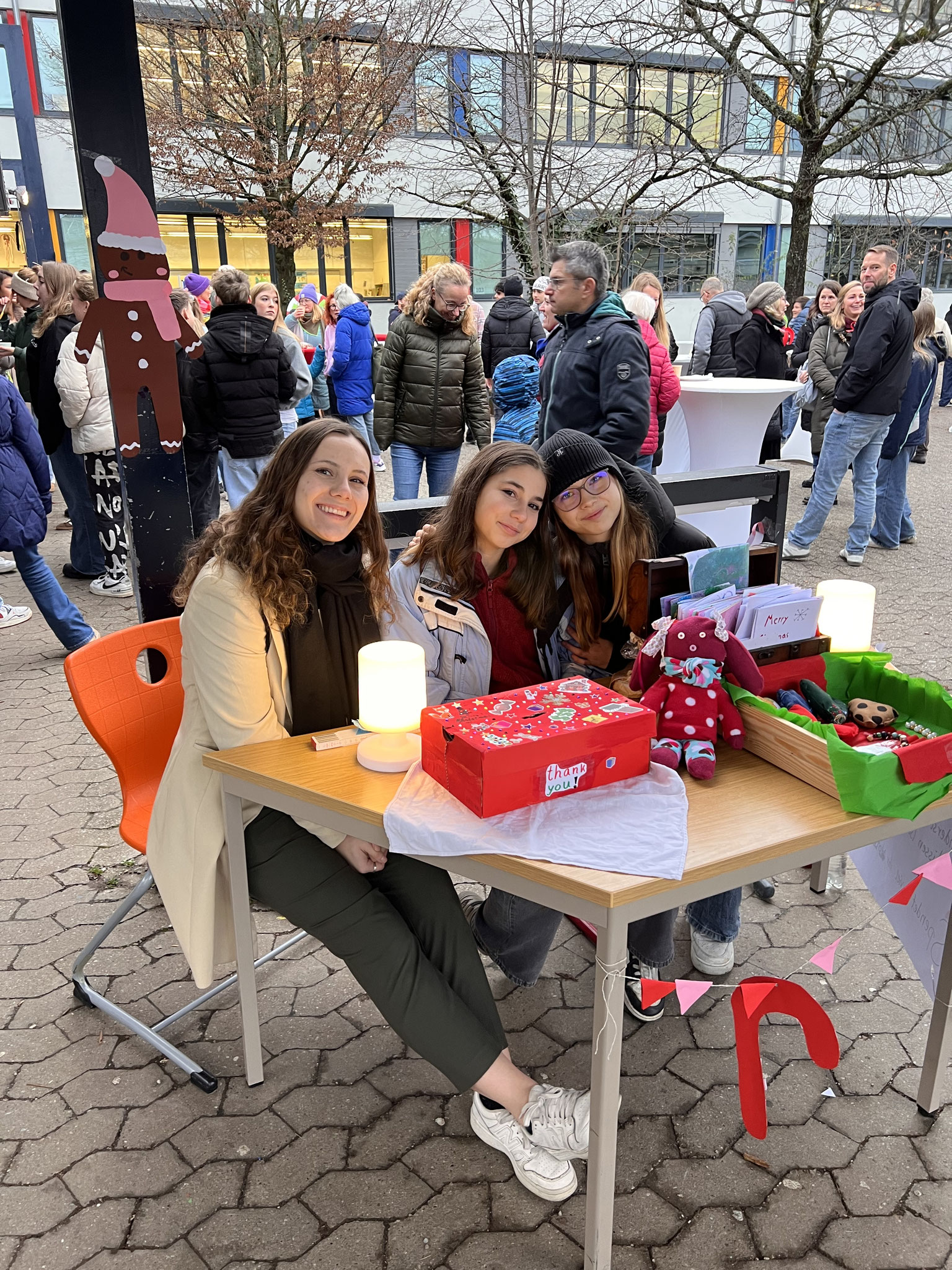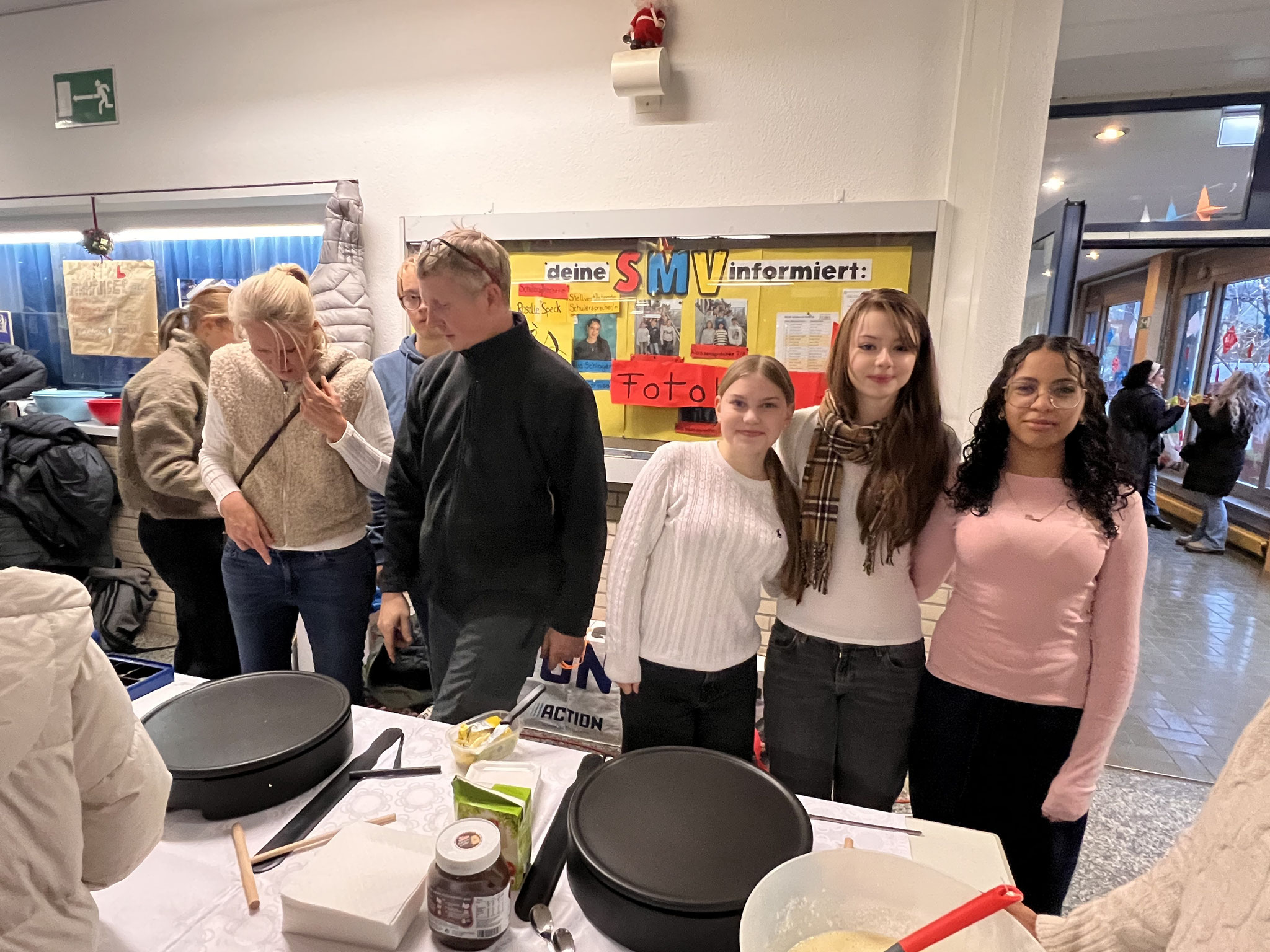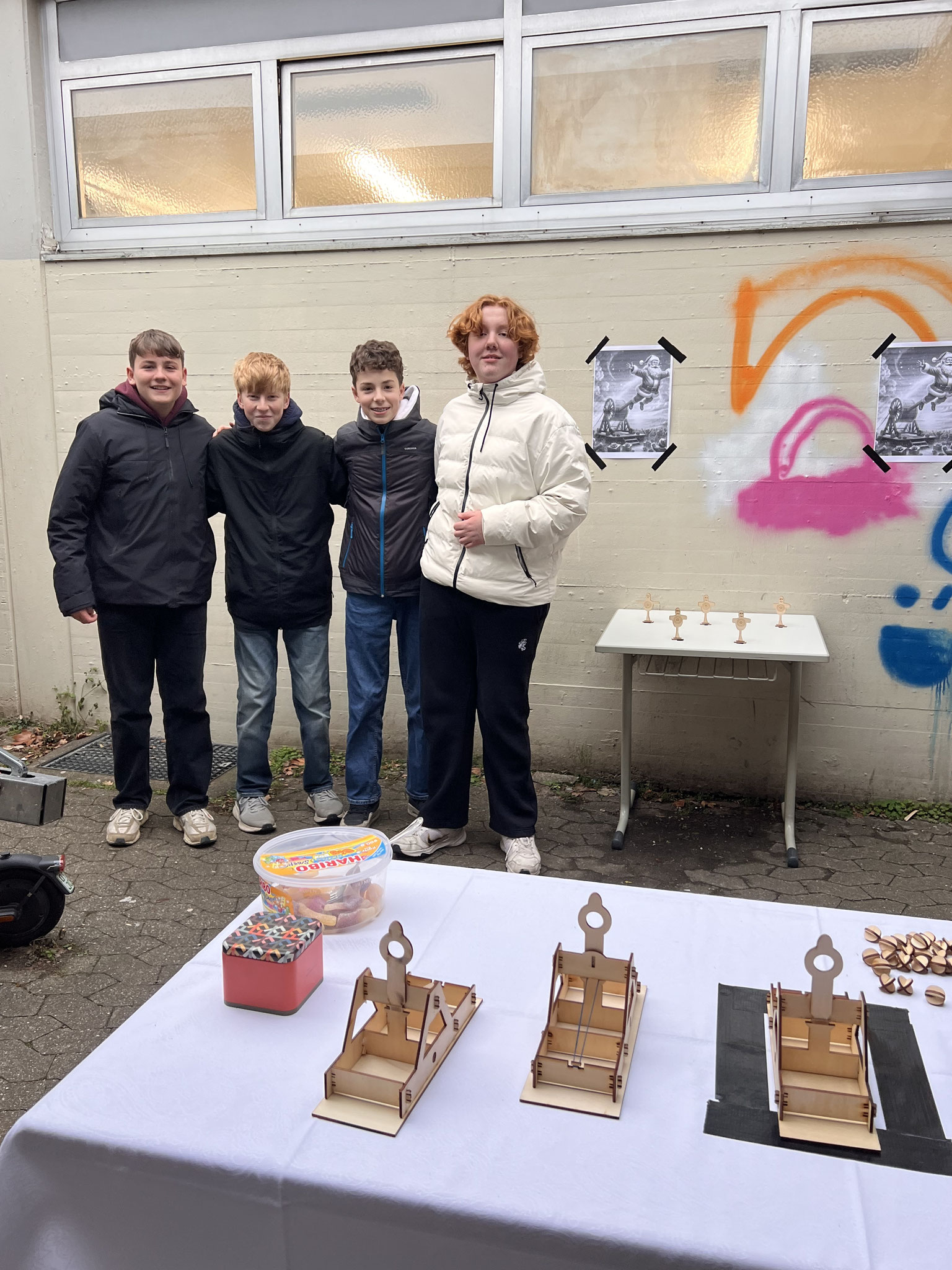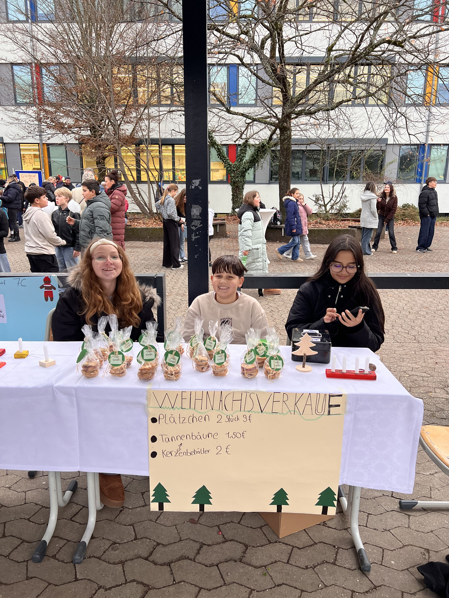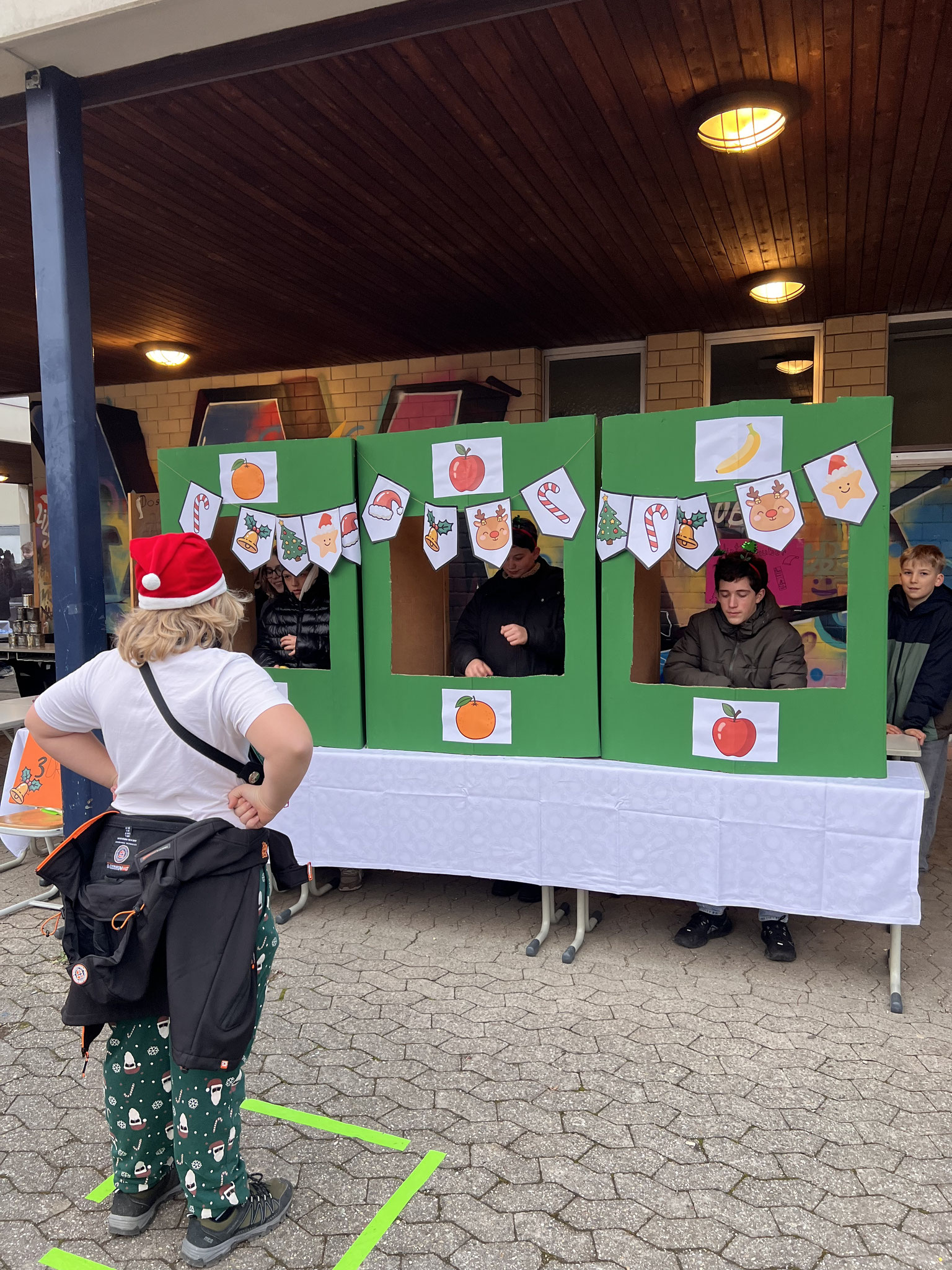 Auch in diesem Jahr hatten sich die Klassen wieder viele kreative Ideen einfallen lassen. Es gab ein Glücksrad, Dosenwerfen, ein Weihnachtsmannkatapult sowie ein menschliches Glücksspiel. Die Schülerinnen und Schüler hatten außerdem Plätzchen gebacken, viele schöne kleinere Winter- und Weihnachtsgeschenke vorbereitet und sorgten mit einer großen Auswahl an Leckereien wie Crêpes, Waffeln, Kuchen, Zuckerwatte, Flammkuchen und vielem mehr für das leibliche Wohl der Besucher.