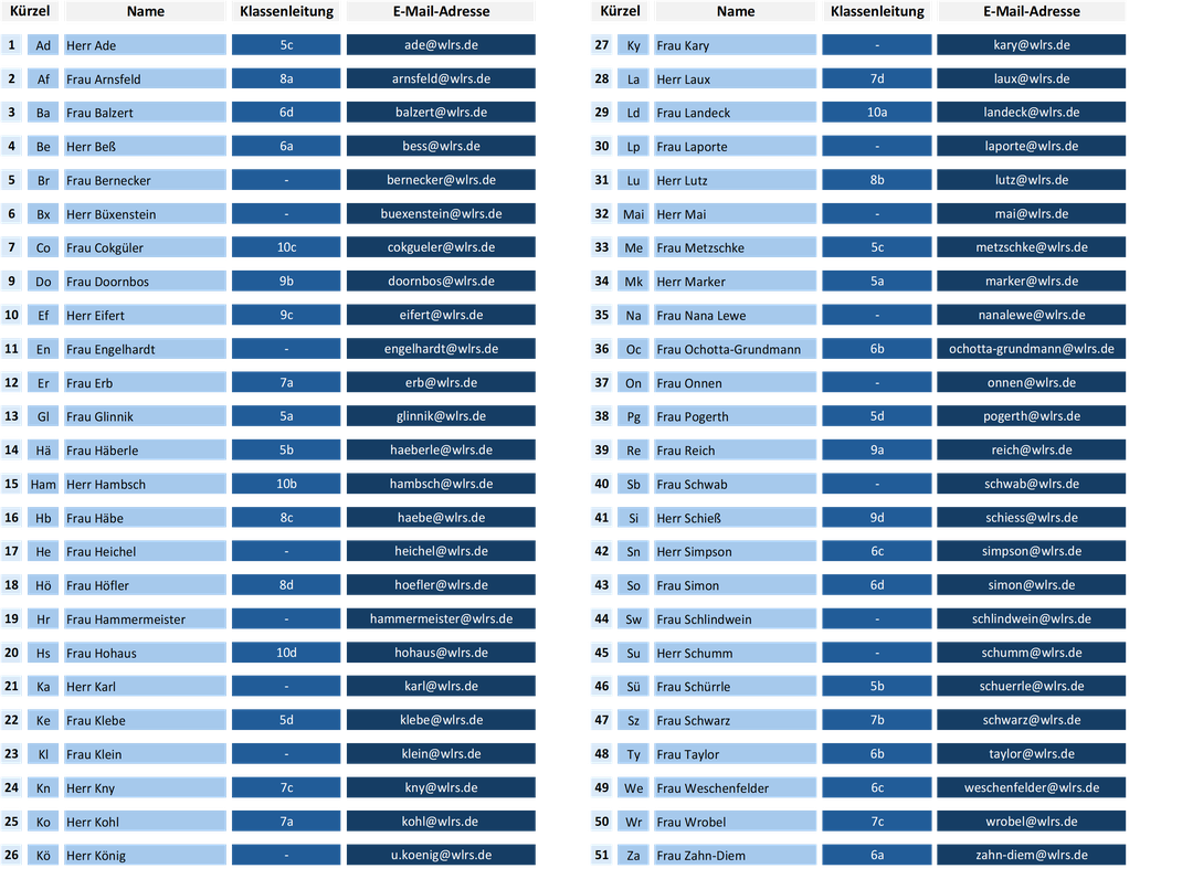 Das Kollegium besteht aus 52 Lehrkräften, darunter eine Referendarin. In den unteren Stufen (Klasse 5-7) wird im Klassenlehrerteam, nach dem Rastatter Modell, gearbeitet.